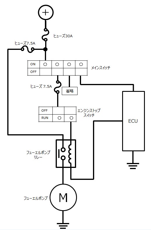 エンジンストップスイッチ、ECUへ電気を供給。この時、ECU内でフューエルポンプリレーコイルの回路をアースに落としフューエルポンプリレーコイル側の回路が成立。