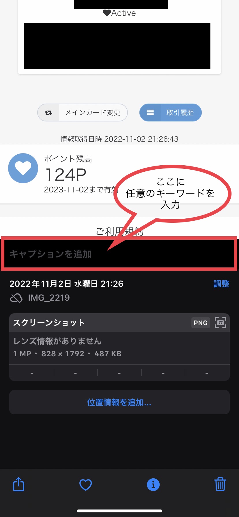 iマークをタップ後、画面中央に「キャプションを追加」が表示されます。ここに「任意のキーワード」を入力します。私は「アストロ会員」と入力しました。