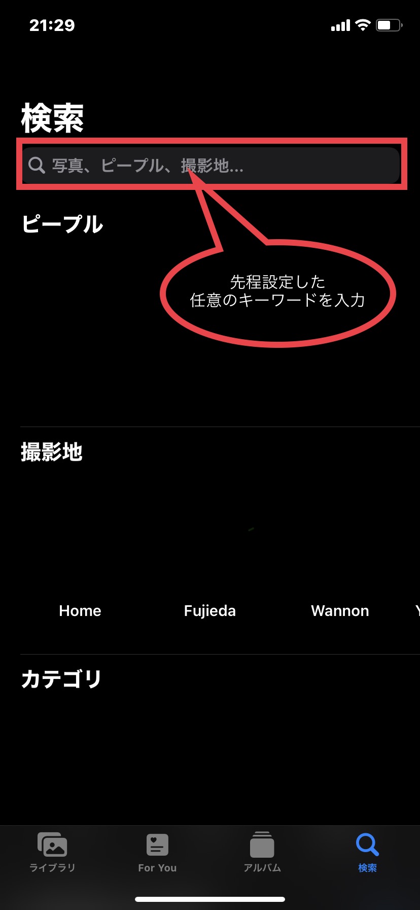 検索窓に先ほど保存したキャプションのキーワードを入力。