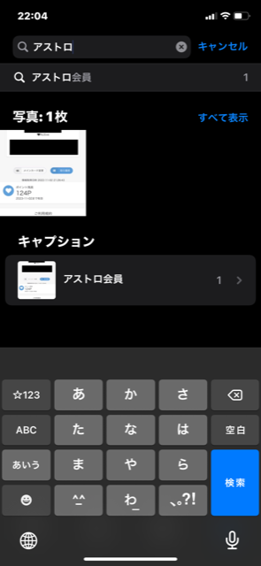 キャプションは「アストロ会員」と保存されいても検索窓に「アストロ」と入力すれば検索可能
